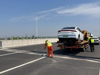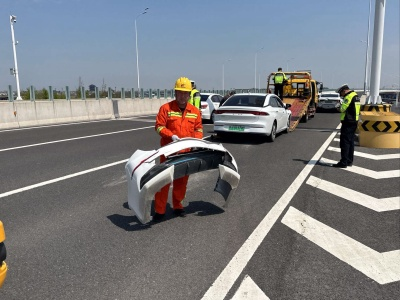 警情就是命令,負(fù)責(zé)該區(qū)域的養(yǎng)護(hù)團(tuán)隊(duì)第一時(shí)間抵達(dá)事故現(xiàn)場,協(xié)助交警對事故現(xiàn)場進(jìn)行車道封閉,設(shè)置指示牌引導(dǎo)其他車輛慢行通過。因車輛撞擊程度嚴(yán)重,導(dǎo)致事故車輛的拖鉤損壞,清障車無法將車輛拉上伸縮板,養(yǎng)護(hù)作業(yè)人員利用撬杠將事故車輛送上伸縮板,使清障車能迅速駛離事故現(xiàn)場,并及時(shí)快速清理事故留下的碎片。至11時(shí)07分,事故的應(yīng)急處置工作圓滿完成,11時(shí)10分左右事故路段恢復(fù)暢通。