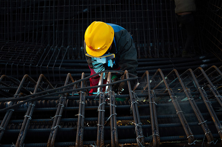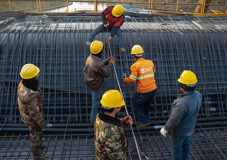 圖為現(xiàn)場工人正在進(jìn)行匝道現(xiàn)澆梁鋼筋施工的鏡頭。