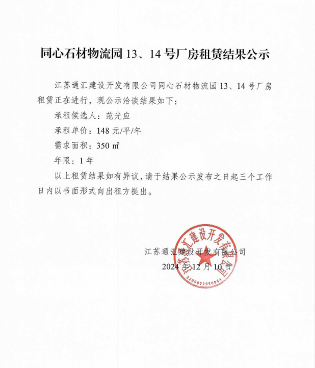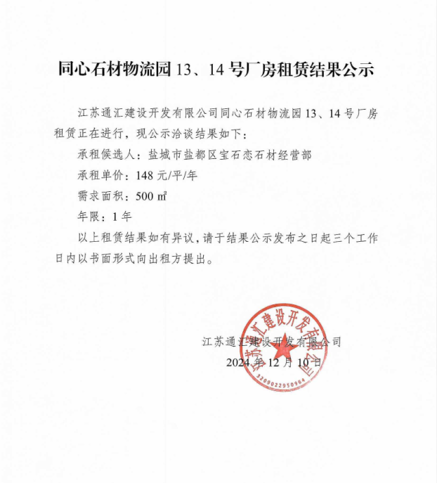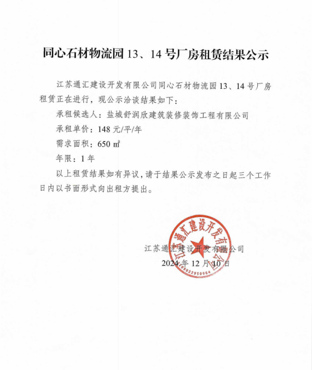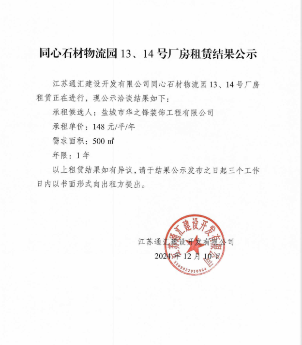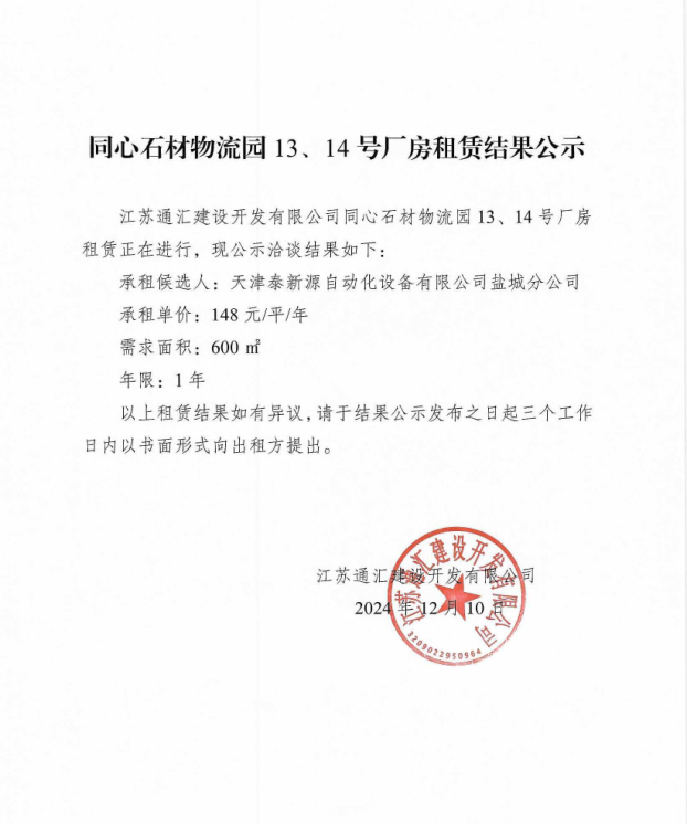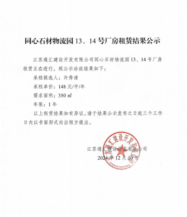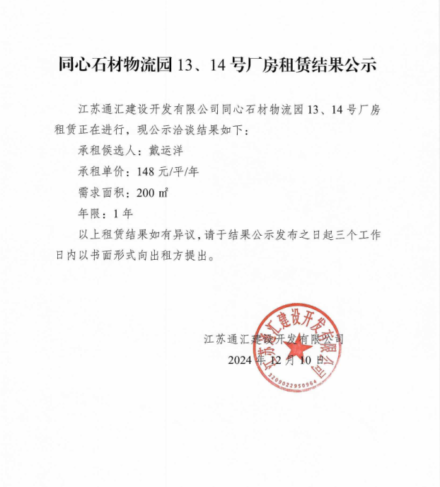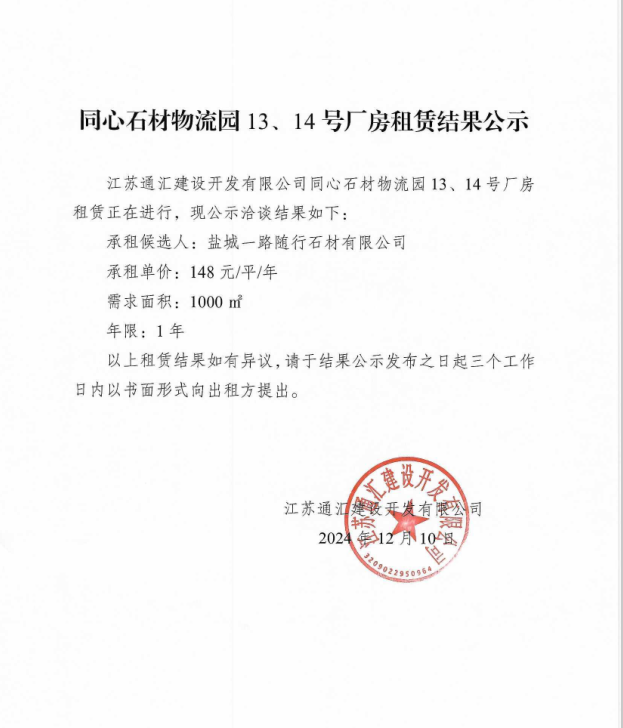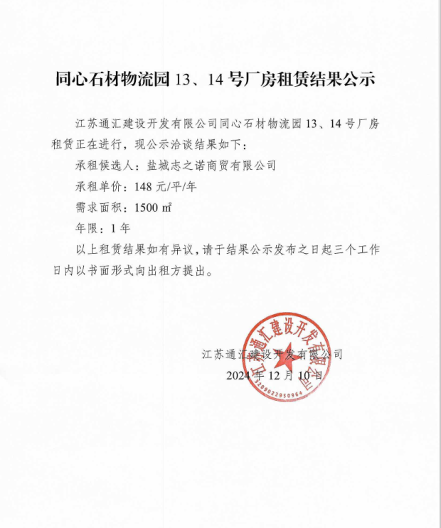 關于同心石材物流園13、14號廠房租賃結果的公示